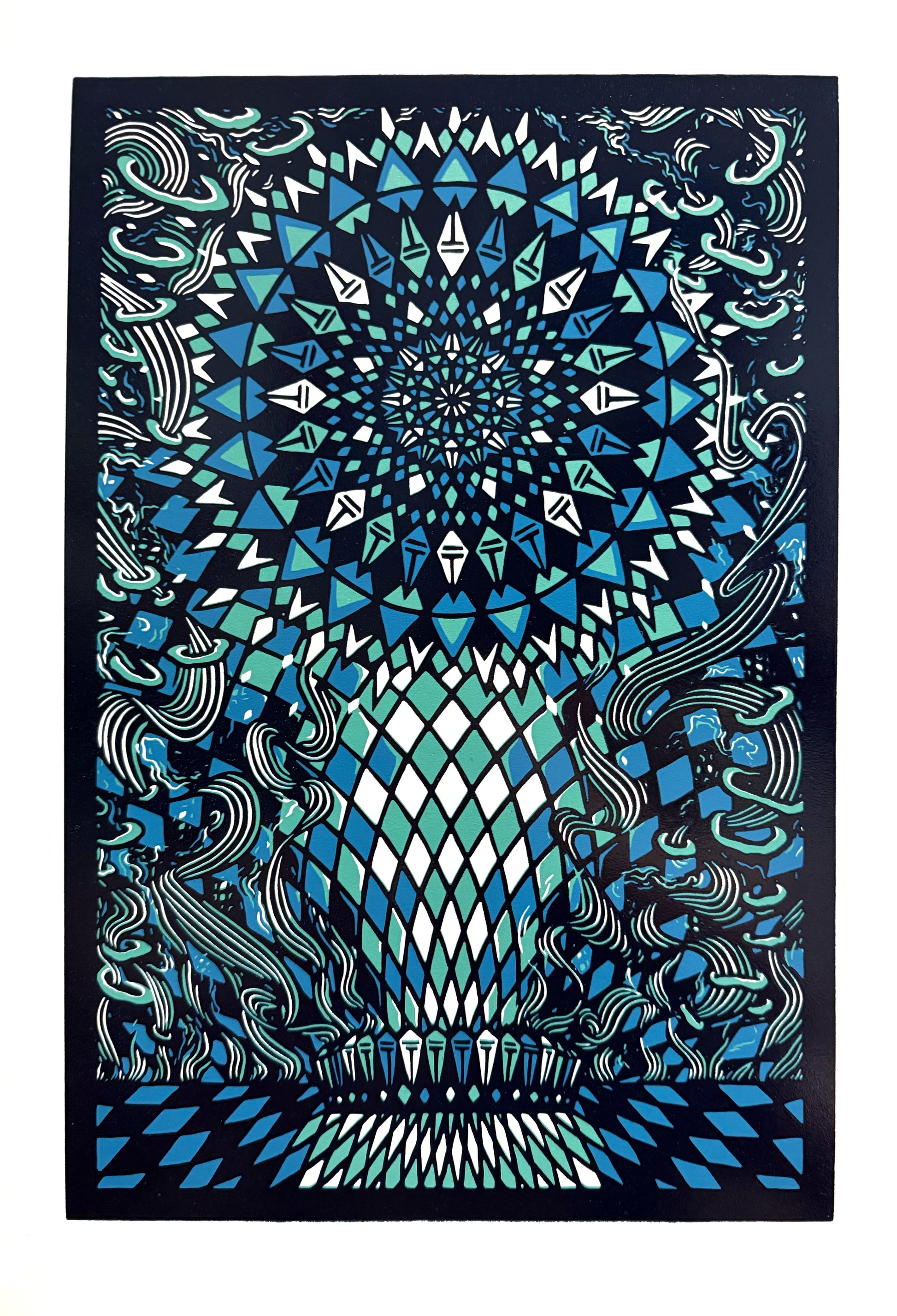 This is a unique color variant of my print “Harlequin Kaleidoscopic”, a piece celebrating the 30th anniversary of Phish at Hampton Coliseum! This print is an edition of only 10. It is printed on 90lb Legion Stonehenge paper with a deckled edge at the bottom. The paper is 15in x 22in and the image is 12in x 18in. This print was inspired by the lyrics of the song "Pillow Jets" and it features some of the most intricate carving I've ever done. These prints will ship out in sturdy Yazoo Mills tubes starting on the week of the 22nd after the Hampton run concludes. Thank you all for your support!