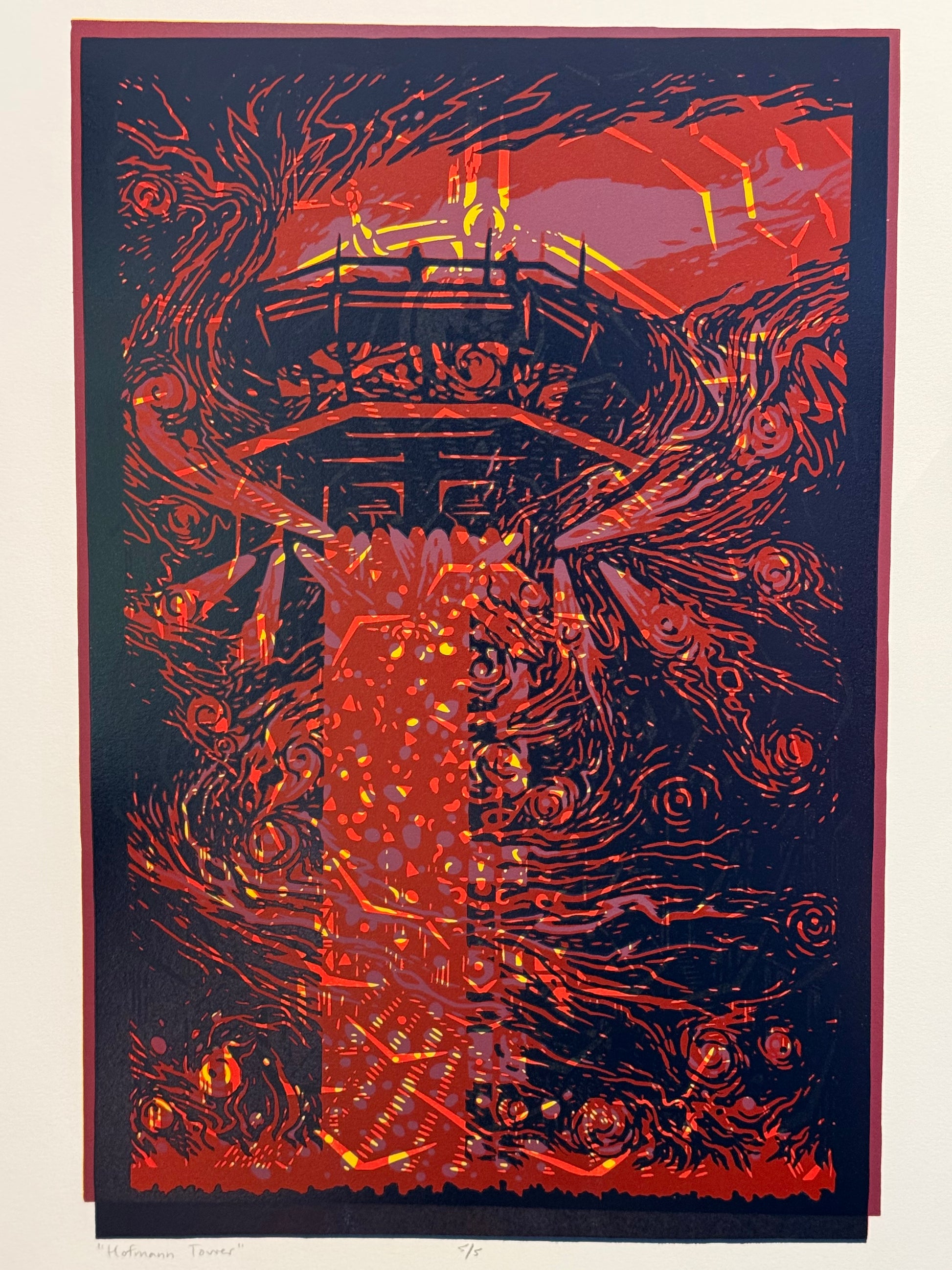 This is a rare 1/1 test print combining layers of Tower Jam III and "The First Ride", a commemorative print for the 75th Anniversary of Bicycle Day!