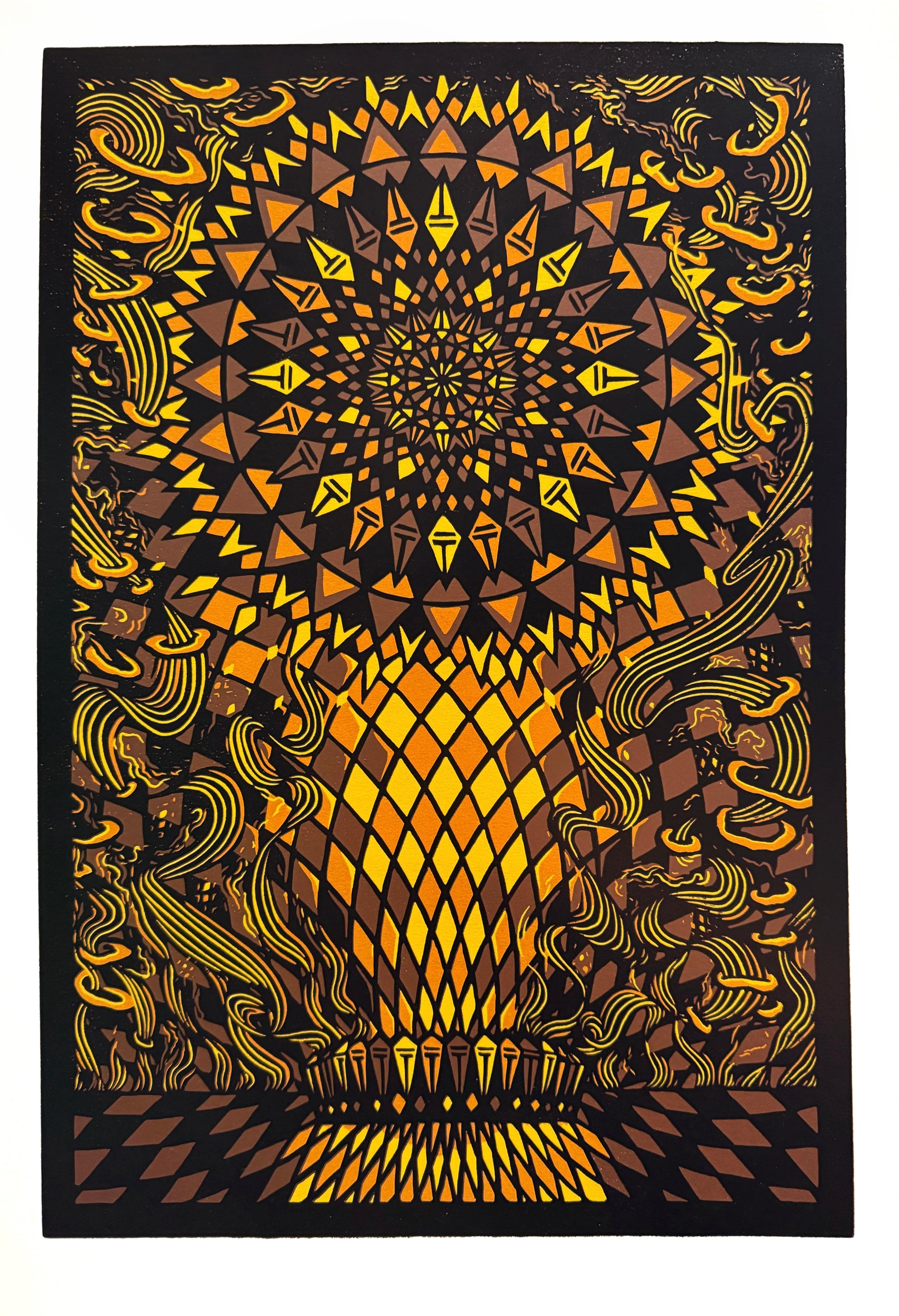 This is a unique color variant of my print “Harlequin Kaleidoscopic”, a piece celebrating the 30th anniversary of Phish at Hampton Coliseum! This print is an edition of only 5. It is printed on 90lb Legion Stonehenge paper with a deckled edge at the bottom. The paper is 15in x 22in and the image is 12in x 18in. This print was inspired by the lyrics of the song "Pillow Jets" and it features some of the most intricate carving I've ever done. These prints will ship out in sturdy Yazoo Mills tubes starting on the week of the 22nd after the Hampton run concludes. Thank you all for your support!