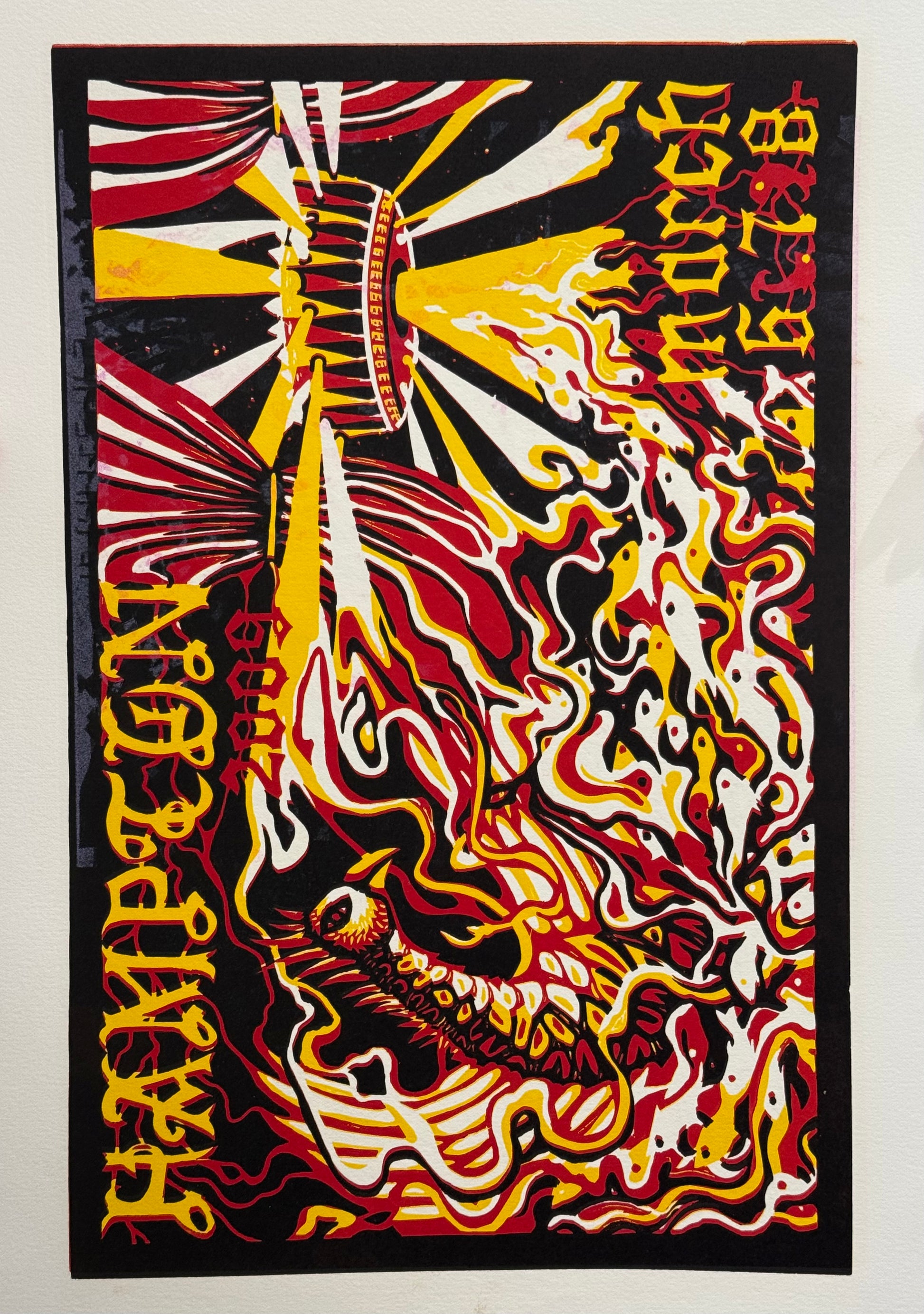 This is a test print from 2009 featuring multiple layers of different prints with a test print of Hampton 2009 on the back.