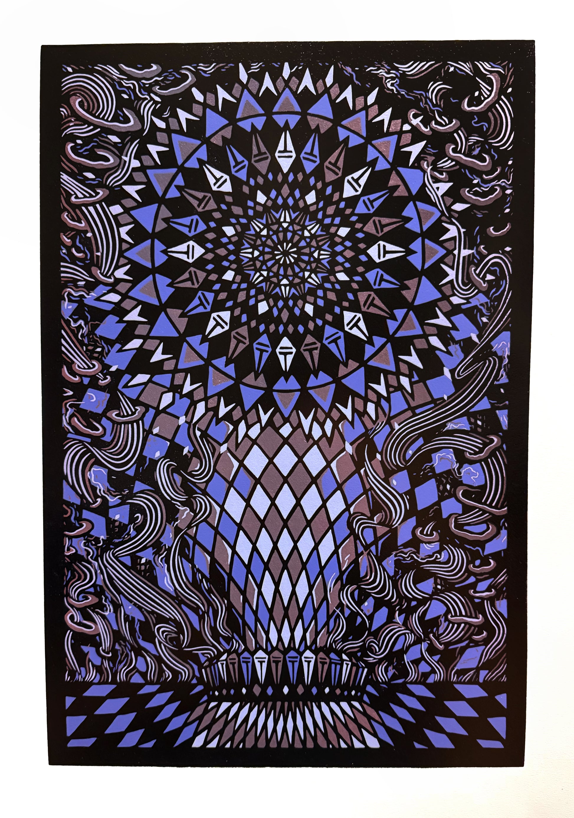 This is a unique color variant of my print “Harlequin Kaleidoscopic”, a piece celebrating the 30th anniversary of Phish at Hampton Coliseum! This print is an edition of only 10. It is printed on 90lb Legion Stonehenge paper with a deckled edge at the bottom. The paper is 15in x 22in and the image is 12in x 18in. This print was inspired by the lyrics of the song "Pillow Jets" and it features some of the most intricate carving I've ever done. These prints will ship out in sturdy Yazoo Mills tubes starting on the week of the 22nd after the Hampton run concludes. Thank you all for your support!