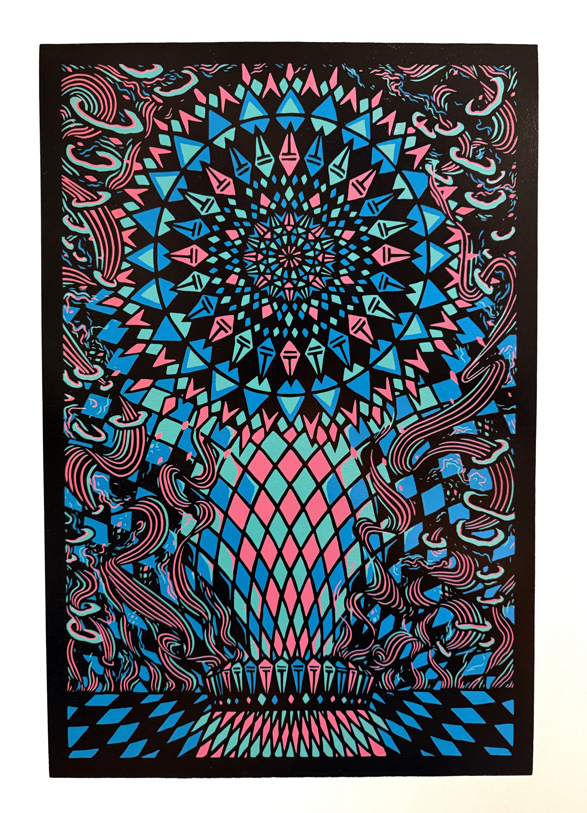 This is a unique color variant of my print “Harlequin Kaleidoscopic”, a piece celebrating the 30th anniversary of Phish at Hampton Coliseum! This print is an edition of only 23. It is printed on 90lb Legion Stonehenge paper with a deckled edge at the bottom. The paper is 15in x 22in and the image is 12in x 18in. This print was inspired by the lyrics of the song "Pillow Jets" and it features some of the most intricate carving I've ever done. These prints will ship out in sturdy Yazoo Mills tubes starting on the week of the 22nd after the Hampton run concludes. Thank you all for your support!
