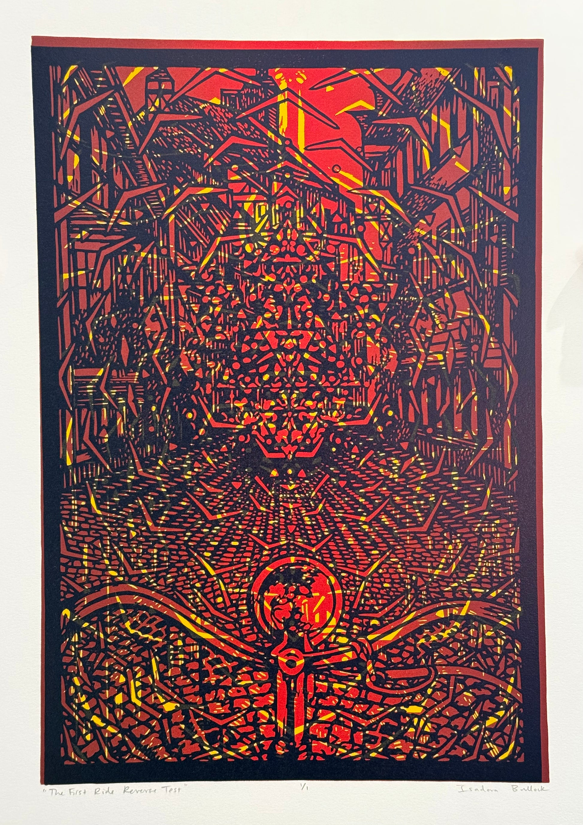 This is a reverse test print of "The First Ride". That means this print was run through first the normal way and then it was run through reversed to create a unique patterned test print.